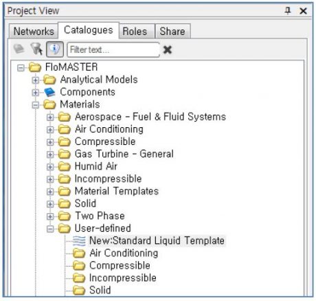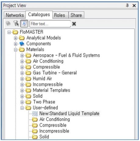 Catalogues Tab → Materials → User-defined내에 신규 생성 유체 확인