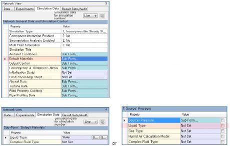 7-1. Simulation Data 에서 적용 : Network View → Simulation Data → Default Materials → Sub Form 7-2. Component에서 적용 : 특정 Component (P Source or F Source)는 component 내의 Property 항목에서 직접 적용이 가능하다.