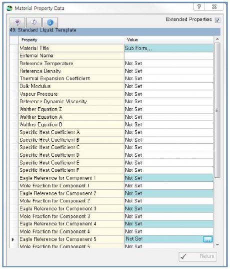 - Standard Liquid Template은 빈 공간(Template)에 사용자가 보유하고 있는 유체의 특성을 적용하거나 FloMASTER가 미리 정의한 Eagle Fluids Database의 data을 기초로 1~5개의 조성비로 구성 된 화합물을 정의하여 상태방정식을 이용한 유체를 만들 수 있다.