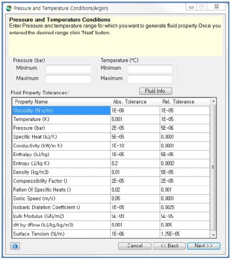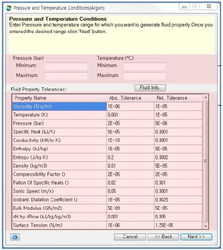 - NIST REFPROP Liquid Template은 지능형 데이터 포인트 생성을 통해 NIST Database로부터 데이터를 가져와 새로이 유체를 만드는 방법으로 사용자는 유체의 작동범위를 직접 설정 할 수 있다. 지능형 데이터 포인트 생성이란 NIST Database에서 미리 정의된 유체의 운전조건을 사용하는 것이 아니라 사용자가 직접 유체의 작동범위(온도 및 압력)을 정의하고 FloMASTER는 그에 따른 ΔT 및 ΔP 값을 계산하게 된다.