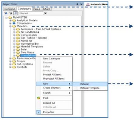 사용자는 Default Materials (Liquid) 외에 다른 유형의 유체(liquid)가 필요한 경우 FloMASTER내에서 신규 유체를 생성 하여 사용을 할 수 있다.