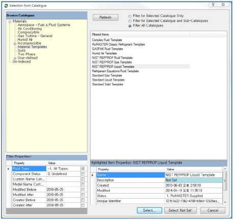NIST REFPROP Liquid Template은 NIST Data에서 미리 정의된 유체의 특성을 기반으로 사용자가 직접 유체의 작동범위를 설정하여 불필요한 작동범위 없이 간단하게 유체를 생성 할 수 있고 Standard Liquid Template은 사용자가 보유하고 있는 유체의 특성데이터를 직접 지정하거나 FloMASTER가 미리 정의 한 Eagle Fluids Database의 data을 기초로 만들기에 사용자 판단 하에 불필요한 데이터 입력 없이 사용자 스스로 원하는 유체의 특성만 지정하여 유체의 생성이 가능하다.